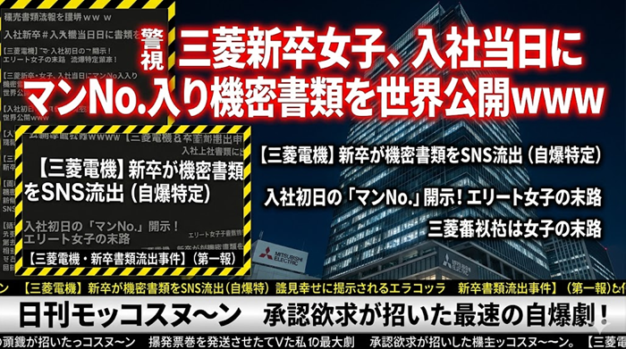 2026年4月、三菱電機の子会社である「三菱電機住環境システムズ」に新卒入社したばかりの女性社員が、自身のInstagramストーリーズに「社員番号(マンNo.)」や「機密保持誓約書」といった内部資料を撮影して投稿。これがスクリーンショットによってX(旧Twitter)などで拡散され、フルネームや所属部署が特定される大炎上へと発展した!