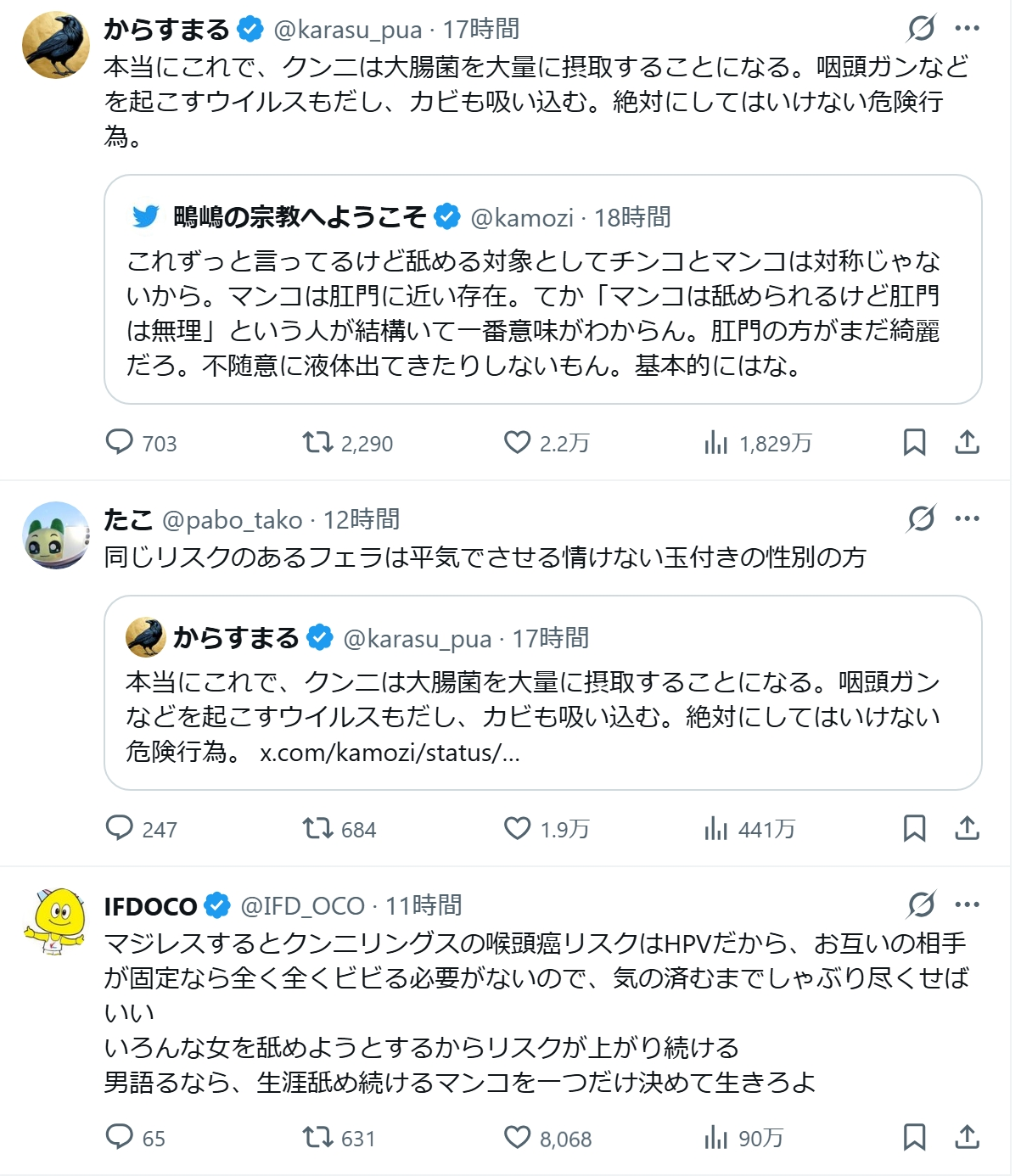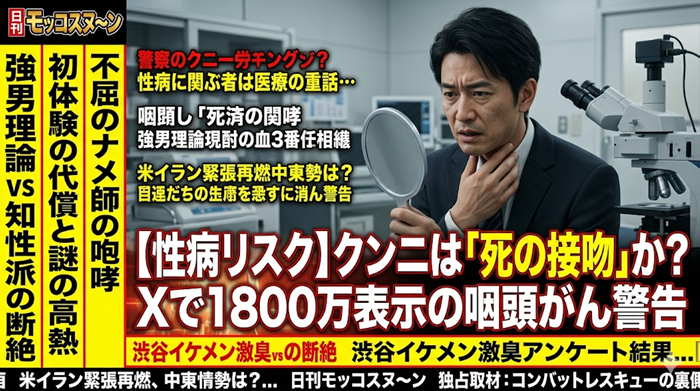 からすまるさんの投稿が「クンニは大腸菌大量摂取や咽頭がんの原因になる」と指摘し、1800万ビュー超を記録。女性ユーザーからは「フェラのリスクを求める男が情けない」との声や、サムソン高橋さんの「クンニできない男は生きる価値なし」などの過激意見も相次いだ。医療的にはHPVなどの性感染症リスクがあり、厚労省やCDCもオーラルセックスの危険を警告。専門家は洗浄やワクチン接種を勧め、個人の選択に委ねる形だ。