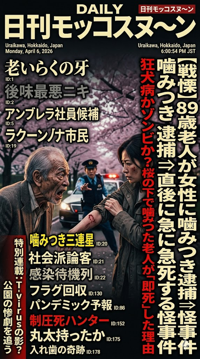 「噛んだ瞬間に絶命する」という、あまりに強烈な幕引き。認知症の周辺症状(BPSD)による攻撃性と、逮捕による極度のストレスが重なった悲劇の可能性が高いが、ネット民はこれを「バイオハザードの開幕」として楽しむ不謹慎さと恐怖の狭間にいる。教訓:高齢者への注意は、命がけのイベントになり得る。