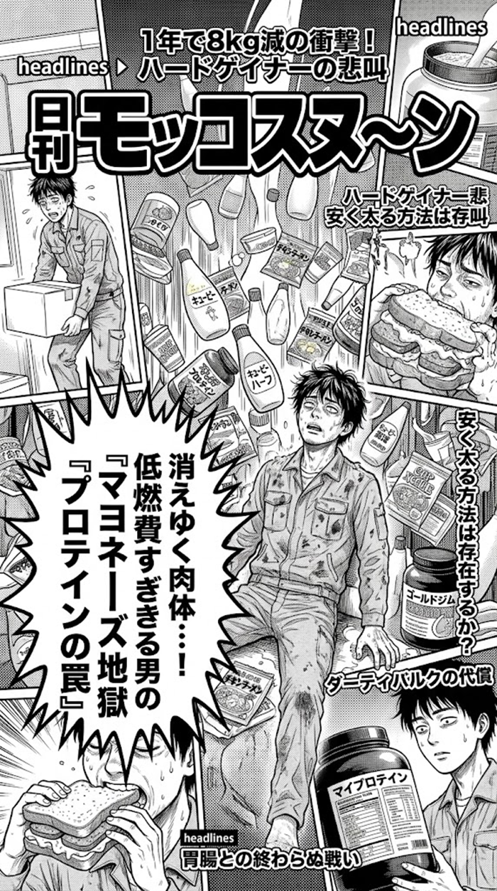 1年で8kgという「肉体の消失」に直面した若き労働者が、安価な増量術を求めてネットの海を彷徨います。
