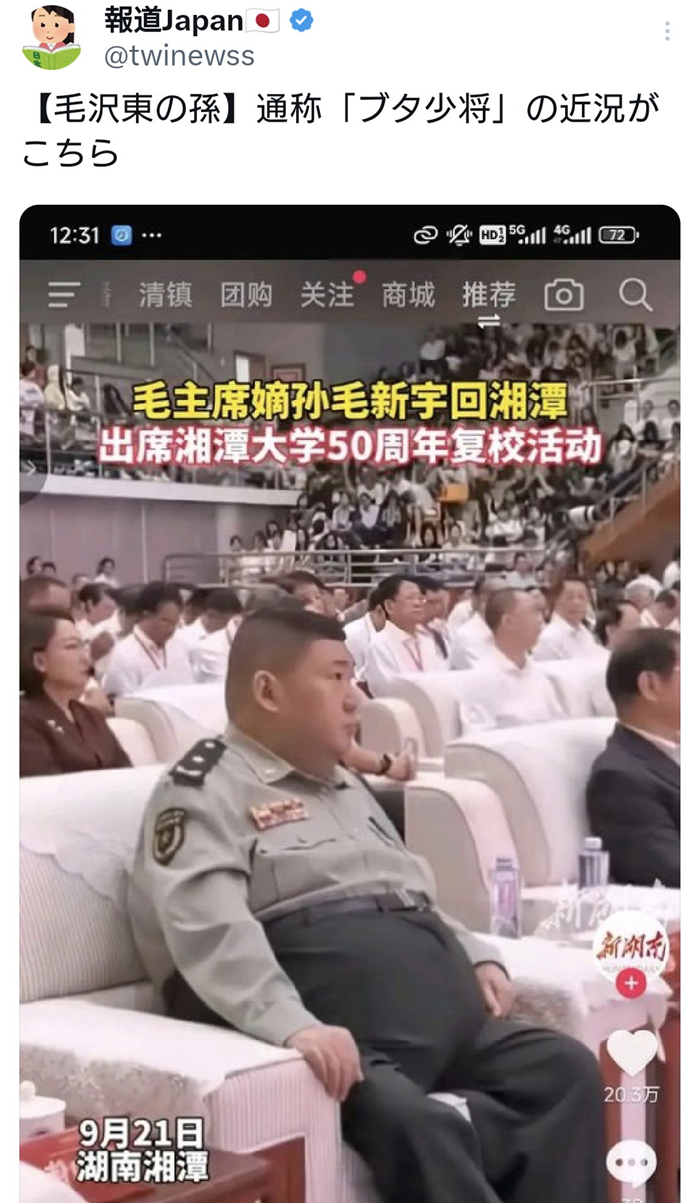 この投稿は、中国共産党の初代指導者・毛沢東の唯一の直系の孫である「毛新宇(もう しんう)」氏の近影を紹介したものです。彼は2010年に史上最年少で「少将」に昇進しましたが、その独特な体型や言動、さらに「達筆すぎる」と皮肉られる筆跡などが、たびたびネットミームとして世界中で注目を集めています。