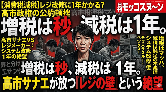 「減税します(ただし1年後な!)」――。期待に胸を膨らませた国民を襲ったのは、あまりにも虚無すぎる「レジの壁」だった。高市政権が掲げた悲願の消費税減税が、産業界の「システム改修が間に合わない」という一言で事実上のストップ。この絶望的な展開に、ネット上では怒りと冷笑の嵐が吹き荒れている。