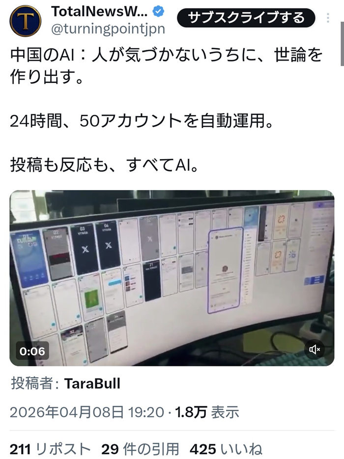 OpenAIなどの調査により、中国のグループがChatGPTなどのAIを悪用して世論工作を行っていた実態が判明しています。かつては人間が手作業で行っていた投稿活動が、現在は大量のスマートフォンを一括管理する「ボットファーム」とAIの組み合わせに進化しており、日本語を含む多言語で不自然な世論誘導が行われていることが国際的な脅威として注目されています。