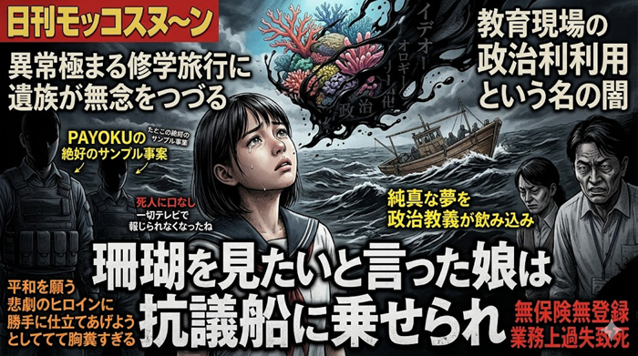 「珊瑚が見たい」という純粋な言葉が、これほどまでに残酷な結末に繋がるとは、遺族の無念は計り知れません。学校という信頼すべき場所が、特定の思想のための「動員装置」と化していた実態。そして、不都合な真実を黙殺するメディア。教育の聖域がイデオロギーに汚染された時、犠牲になるのは常に未来ある子供たちです。この悲劇を「不運な事故」で終わらせてはなりません。
