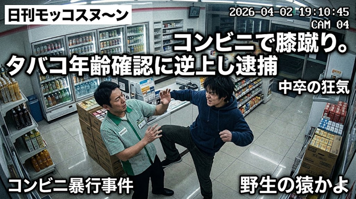 2026年4月2日、香川県琴平町のコンビニで15歳の少年がタバコ購入時の年齢確認に激高。30代の男性店員に対し、数分間にわたり胸を突き飛ばす・膝蹴りをするなどの暴行を加えました。店員は全治1週間の怪我を負い、少年は傷害容疑で琴平署に逮捕されました。少年は容疑を認めています。