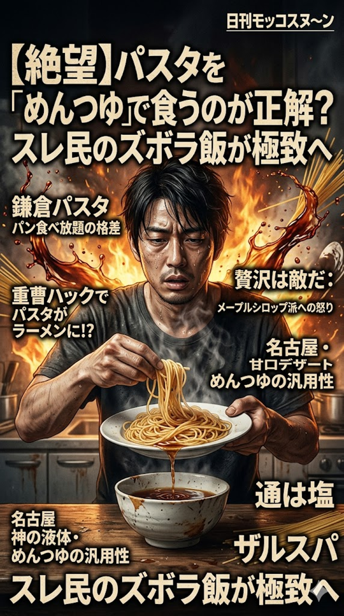 結局のところ、パスタは「長い小麦粉の塊」に過ぎないのだ……。イタリアの伝統も大事だが、日本の「めんつゆ」という神の液体がすべてを和解させてしまう。重曹ハックから、名古屋の甘口パスタまで、炭水化物の可能性は無限大。今夜は、台所の奥で眠っている「お吸い物の素」を引っ張り出してみるのも悪くないだろう。