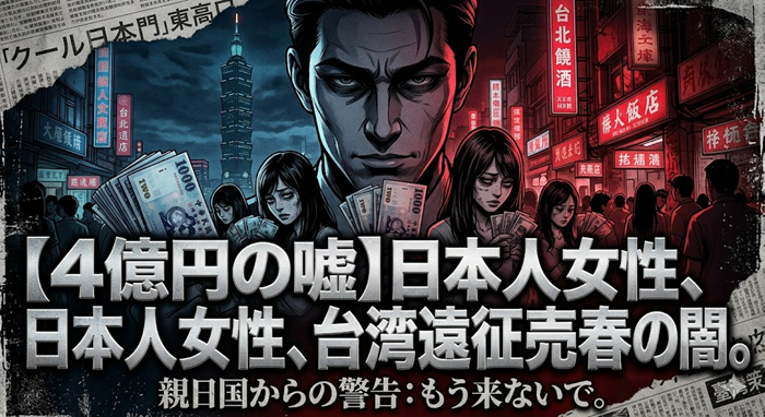 リサーチによると、台湾の三立新聞(2026年3月28日)がこの件を大きく報道。実際に2025年8月には台中市警察局が観光ビザで入国し売春を行っていた日本人女性3名を摘発しています。ただし、スレ内で物議を醸している「3ヶ月で4億」という数字については、現地の風俗相場から見て「非現実的な誇張」である可能性が極めて高いと分析されています。