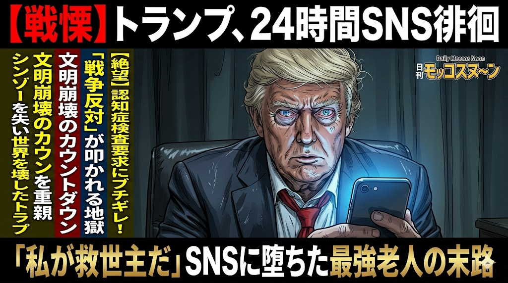 アメリカのトランプ大統領は、SNSが大好きなおじいちゃんです。でも、普通の人と違うのは、夜中も朝方もずっと書き込みをしていること。専門家は「ちゃんと寝ないと、大事な判断を間違えるよ」と心配していますが、本人は「寝るやつは負け犬だ!」と言い張って、誰の言うことも聞かずにスマホを離さないのです。