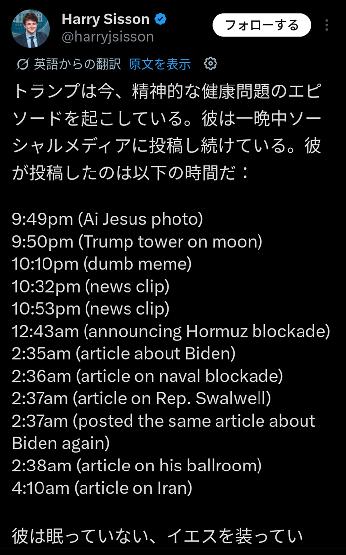 SNS上の投稿履歴から、トランプ氏が1時間おきにメッセージを投稿し続けていることが発覚。以前から1日3〜4時間しか寝ないショートスリーパーを自称していましたが、今回は「完全に24時間起きているのではないか」と健康状態を危惧する声が上がっています。