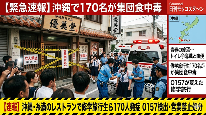 沖縄本島・糸満市のレストランを原因施設とする集団食中毒が発生したと発表した。170人の修学旅行生らに腹痛や下痢や血便等の症状が表れ、このうち68人から腸管出血性大腸菌「O157」が検出された。