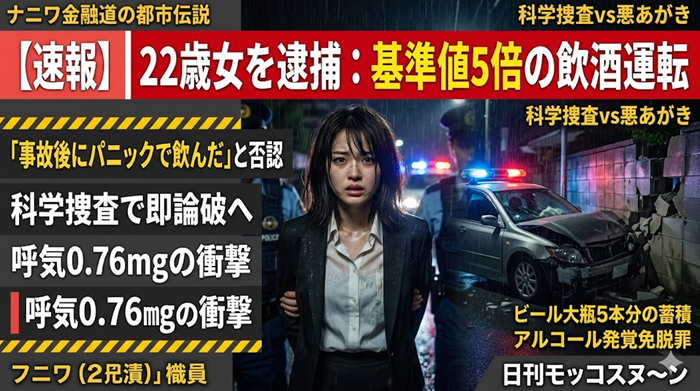 2026年4月14日、米子市の市道で22歳の会社員女性がブロック塀に衝突。駆けつけた警察官が呼気検査をしたところ、0.76mg/Lという異常な数値を検出しました。女性は「事故を起こすまでお酒は飲んでいない」と容疑を否認。しかし専門家は、0.76mg/Lは純アルコール40g(ビール中瓶2本分以上)の蓄積が必要であり、事故直後の摂取では説明がつかないと指摘しています。
