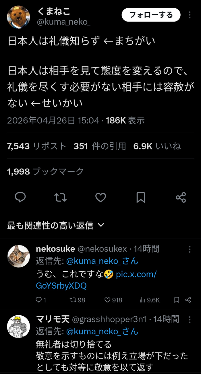 (元スレ:外国人「日本人は礼儀知らず」日本人「日本人は相手を見て態度変えてるだけ」←論破で拍手喝采)