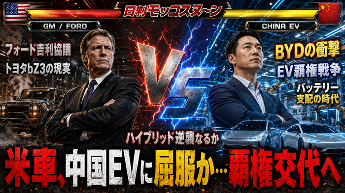フォードと中国・吉利が技術提携を協議しているとロイターなどが2026年2月に報道。中国EVはバッテリー・価格競争力で優位とされ、米メーカーは苦戦が続いている。ただし米国では大型車市場が強く「完全敗北」とまでは言えない状況。