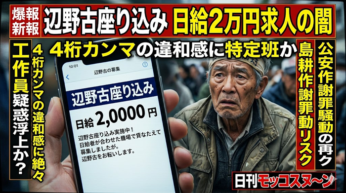 SNS上で拡散された「辺野古周辺での座り込み運動」の求人募集とされる画像についての話題です。日当20,000円、弁当付きという破格の条件が提示されていますが、2024年に漫画『社外取締役 島耕作』が同様の「日当デマ」を描写して謝罪・訂正に追い込まれた経緯もあり、情報の真偽を巡って激しい議論が起きています。