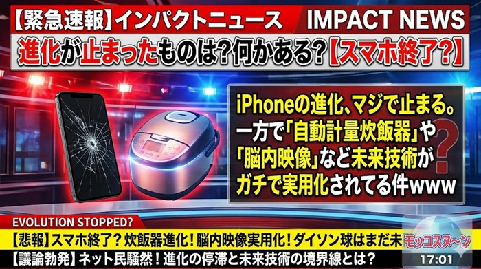 おっす、編集長や!今日は「進化が止まったもの」っていう、全人類が薄々感じとる絶望的なスレを一本釣りしてきたで。 iPhoneがただの板切れに見えてきたヤツ、炊飯器に米入れるのすらダルい情弱、宇宙の真理を知りたいコスモポリ… 続きを読む 【悲報】iPhoneの進化、マジで止まる。一方で「自動計量炊飯器」や「脳内映像」など未来技術がガチで実用化されてる件www