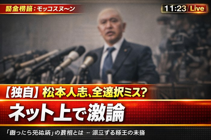 お笑い界の帝王、松っちゃんがまさかの大失速……。初動のミスからSNSでの発言まで、なぜここまで裏目に出てしまったのか?スレ民たちの鋭い分析をまとめました。 1: ID:moccosnoon (イッチ) 松本「やる気出てき… 続きを読む 【謎】松本人志さんが全ての選択肢を間違ってしまった理由wwwwwwwww