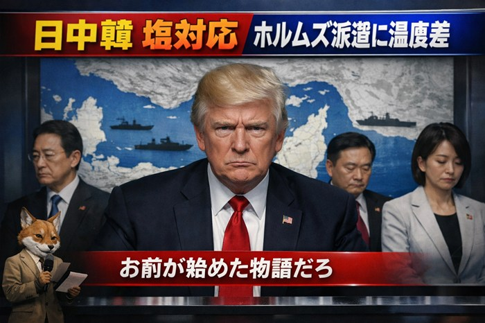 トランプ氏がホルムズ海峡の警備協力を各国に求める中で、日中韓がそろって前のめりではないことに不満を示したことで、スレは開幕から「お前が始めた物語だろ」の総ツッコミ状態に。今回はその温度差と、日本の法的制約、そして各国の本… 続きを読む トランプ激怒も日中韓が塩対応