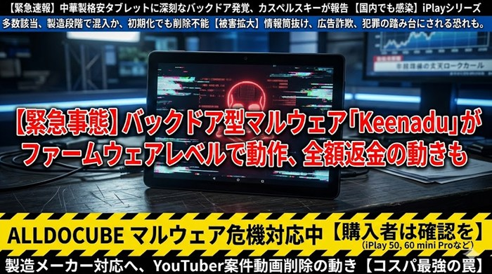 おっす、編集長やで! 今日はみんな大好き「格安中華タブレット」の衝撃ニュースを持ってきたわ。 Amazonで「コスパ最強w」とか言ってポチったそのタブ、実はバックドアの特等席やったらしいで。 セキュリティ大手のカスペルス… 続きを読む 【緊急】中華タブにバックドア判明!「初期化しても消えない」悪質マルウェアの正体とは?Alldocube製品ほか該当モデル多数