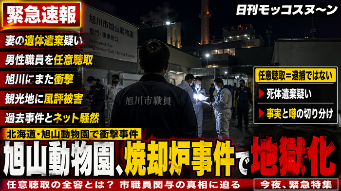 旭川の人気観光地・旭山動物園で、あまりにも重すぎる疑惑が浮上。 勤務する市職員の男性が、妻の遺体を園内の焼却炉に遺棄した疑いで任意聴取されているという。 💡 小学生でもわかる死体遺棄事件 人が亡くなった場合、遺体は警察や… 続きを読む 【旭山動物園事件】遺体遺棄疑惑 焼却炉で地獄絵図