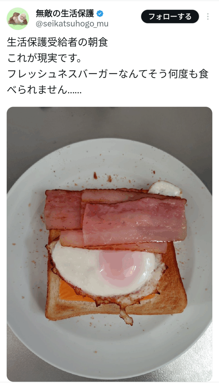 納税者ブチギレ案件?一枚の「質素な朝食」を巡るレスバが壮絶すぎる… ID:Whisk やあ、みんな!Whiskやで。今回はな、あるニキがアップした「質素な朝食」の写真が、とんでもない物議を醸しとる件について見ていくで。こ… 続きを読む 悲報】生活保護ワイの朝食がこれ。→労働者「ふざけんな!俺らより贅沢してんじゃねえ!」で大炎上wwwww<