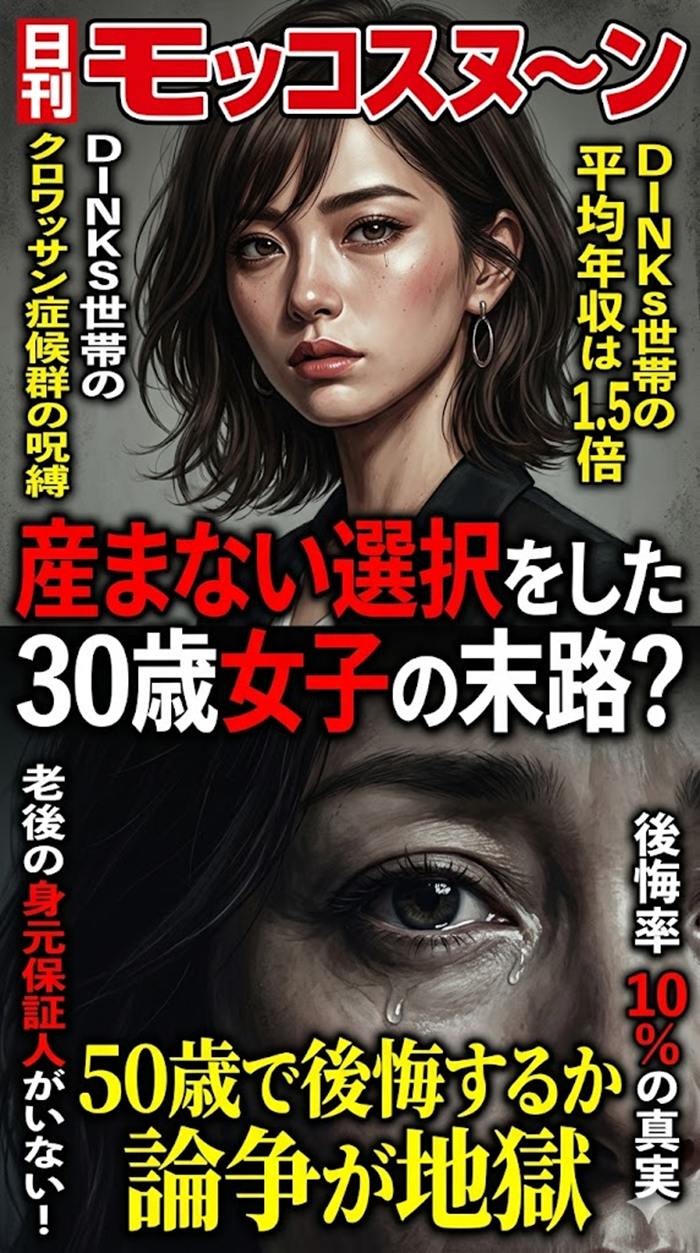 「30歳だけど子供産まない選択をした」と語る女性たち。今の自由を謳歌する彼女たちに対し、ネット上では「50歳になった時の悲惨な姿が楽しみ」と断言する超過激な投稿者が現れ、全方位へのレスバトルに発展!「クロワッサン症候群」… 続きを読む 【産まない選択】30代DINKsの自由と50代の末路